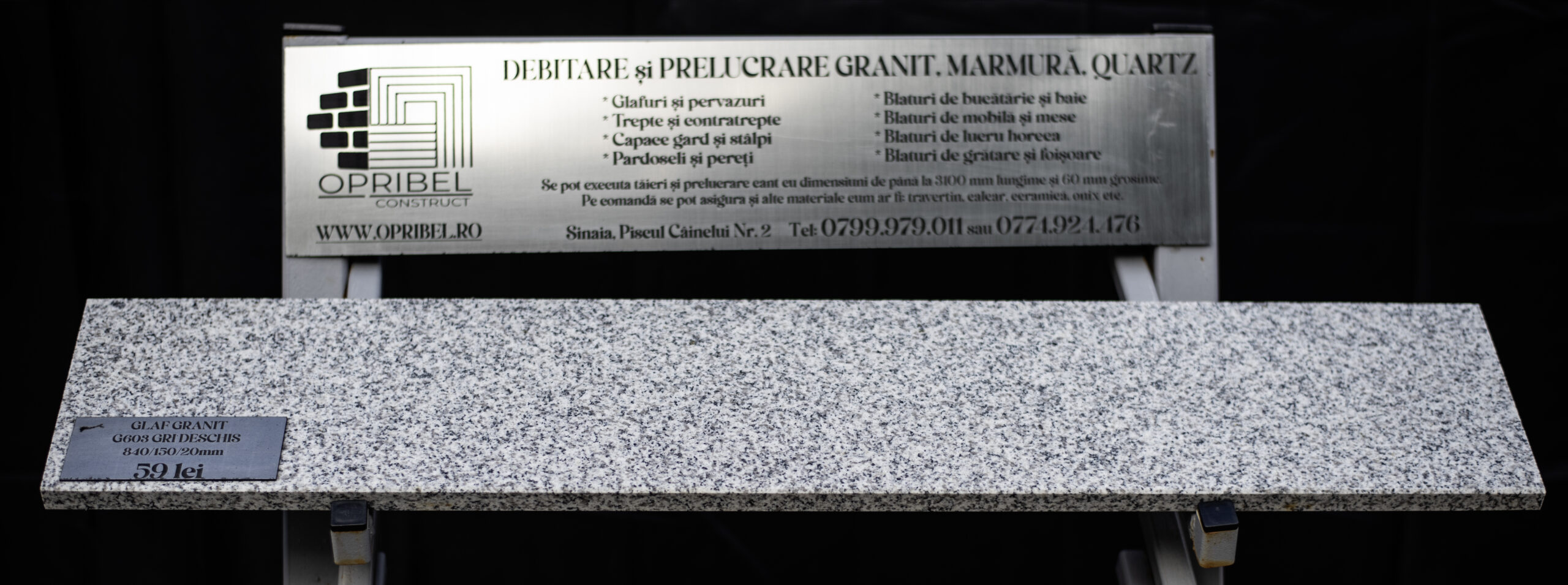 Granitul G603 este recunoscut pentru aspectul său uniform și rezistența la factori de mediu. Fiecare glaf este tăiat cu precizie în atelierul OPRIBEL și poate fi personalizat la cerere.
